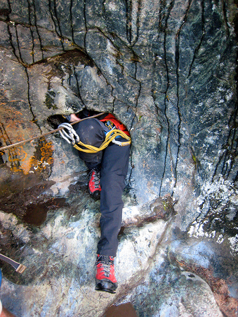 The water-carved slabs are always slippery, but especially so in the rain! It appears the season is over, but we hope to see Mark and Peter again in '09. |