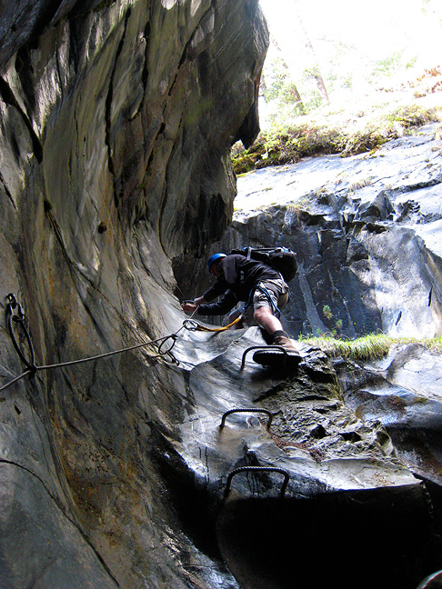 On our last day the rain came, so we enjoyed our favorite rainy-day activity in Zermatt, the Gorner Gorge fun-ride! Here in a tight squeeze before another zip-line traverse, we all get muddy and wet. |