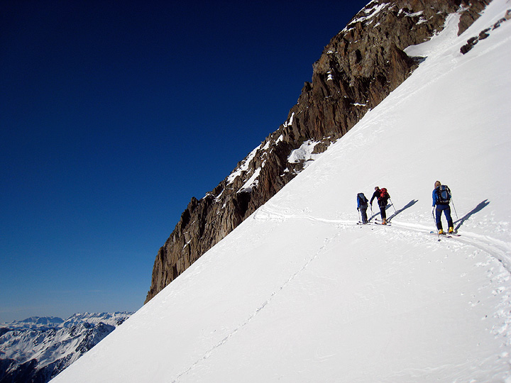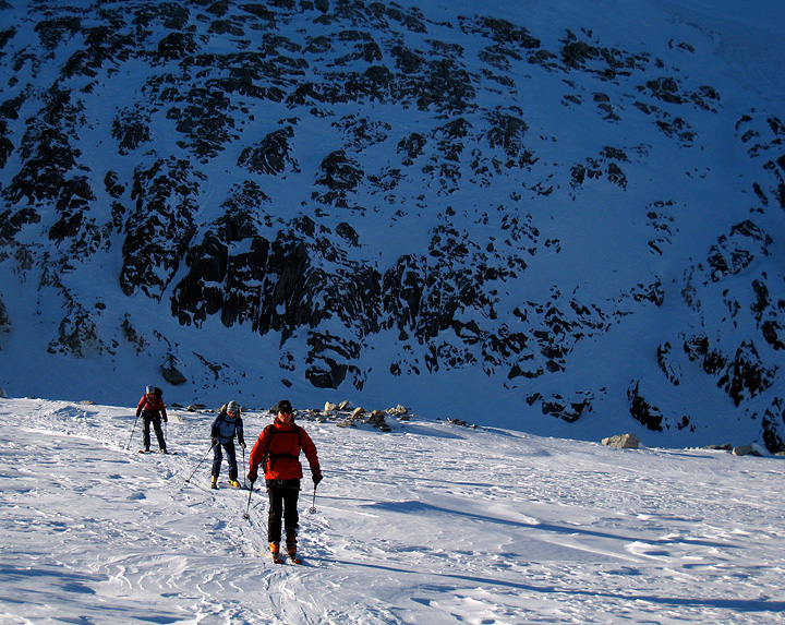 Soon though we had a great skin up a good track to the base of the couloir leading to the Col. |