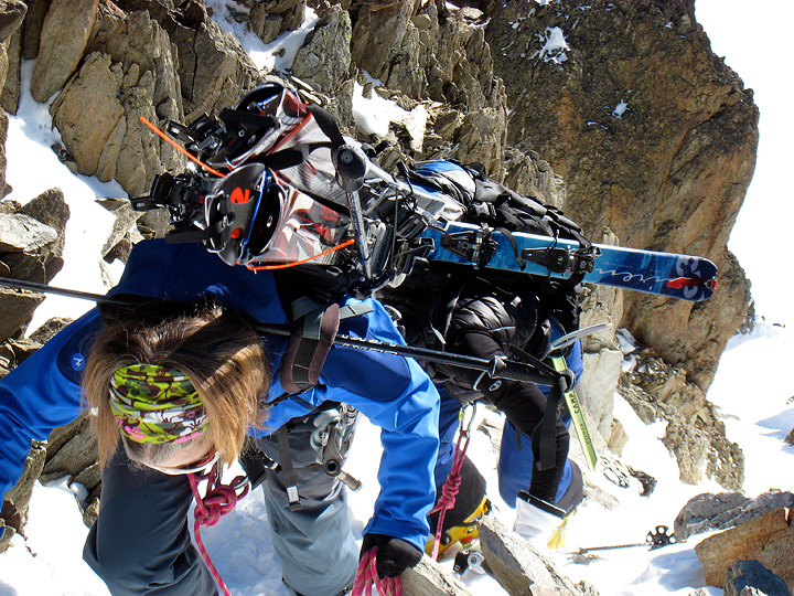 After riding to the top of the Grands Montets and descending to the Argentière Glacier, we cross over to the climb up toward the Col. |