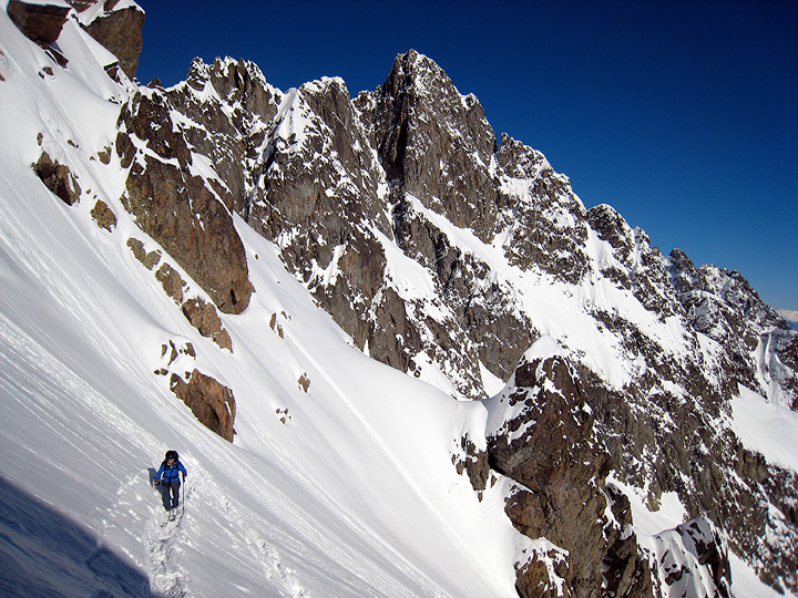 Skinning up, all alone, the slopes below the Aiguille de Bérard. |