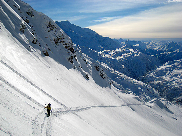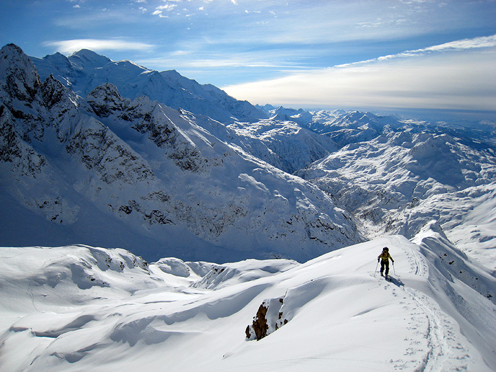The views from the ridge leading up to the Aiguille de Bérard are fantastic, and at this time of year, after a heavy snowfall we have the place all to ourselves. |