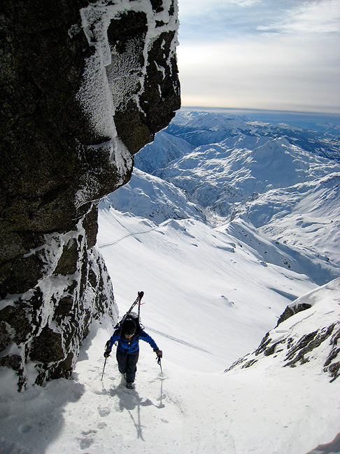 In the steep and narrow brèche, a bit of booting is necessary. |