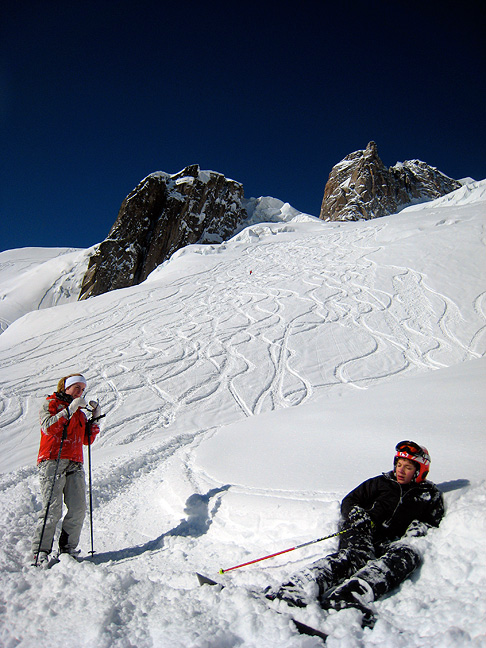 | Kathy had a fantastic trip down the Vallee Blanche in February, with two father/kid family combos from the U.K. (friends of Ken Seamon's who is frequently featured on these pages). LOTS of new snow, and we ate it up greedily. |