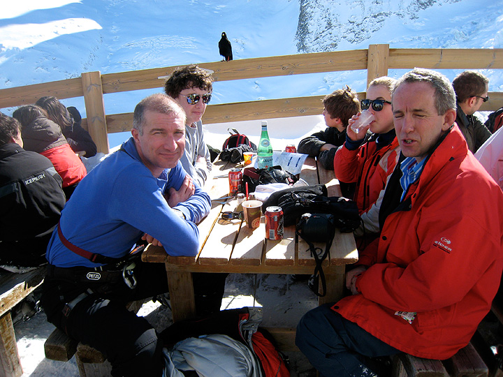 A wee pause for sustenance at the Requin hut, a Choucas waits for crumbs and eavesdrops on the conversation. George has a chat with him. |
