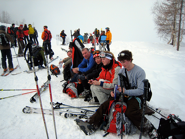 This early in the year, we are able to ski all the way into town, avoiding the Montenvers train finish. The price for this privilege is a steep, though short, climb up off the Mer de Glace to the buvette at Les Mottets. At the buvette, a general pause to enjoy last views of the high mountains before turning the corner and skiing the trees to town. |