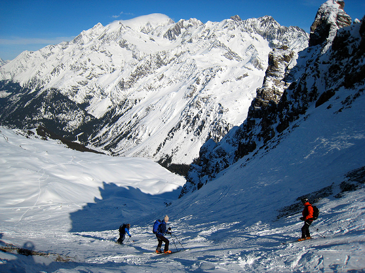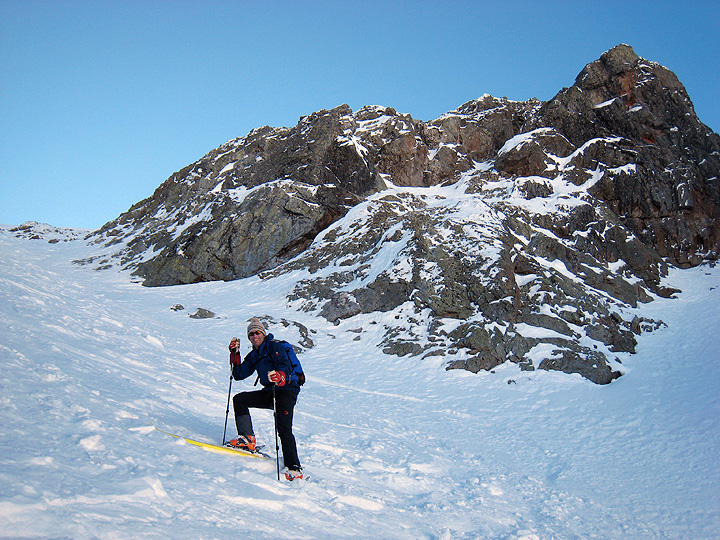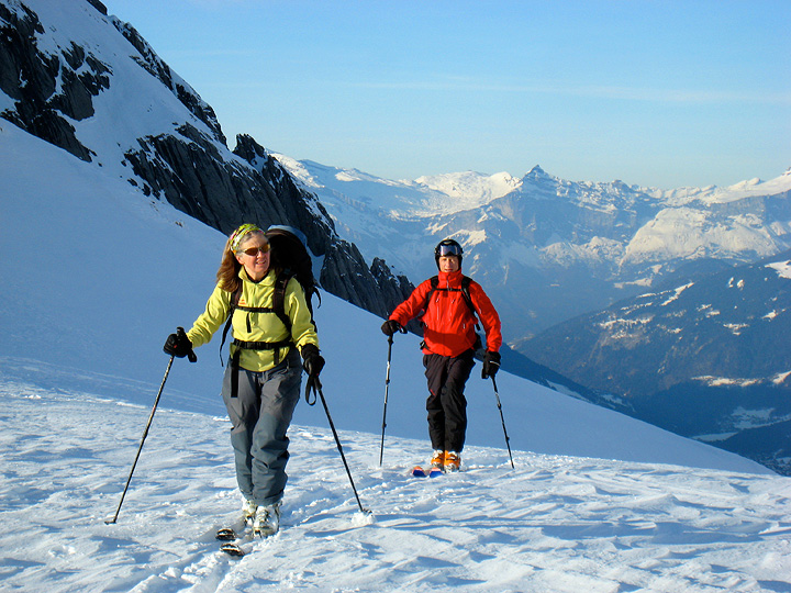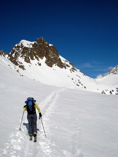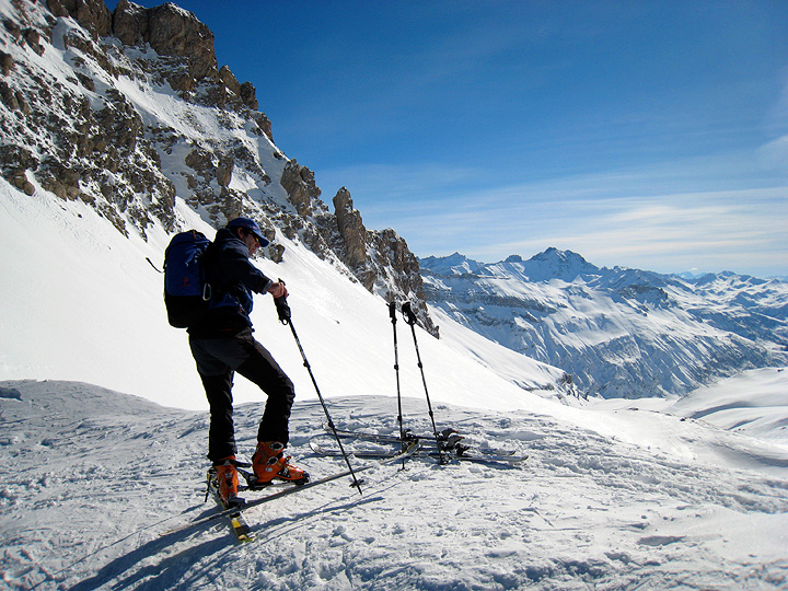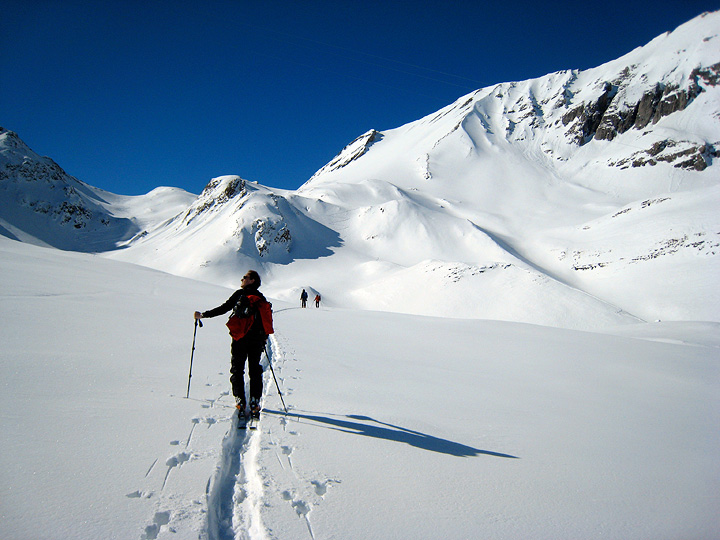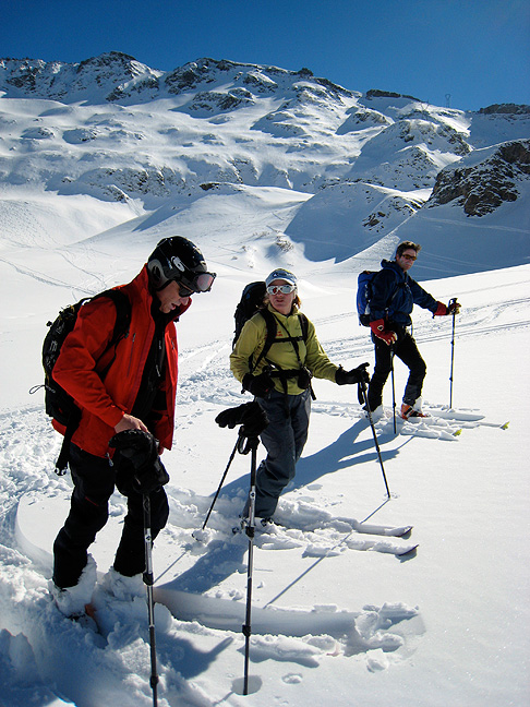 Leaving the top of the lift system far behind, we enjoy lovely sunshine as we skin toward the Col de la Cicle. |