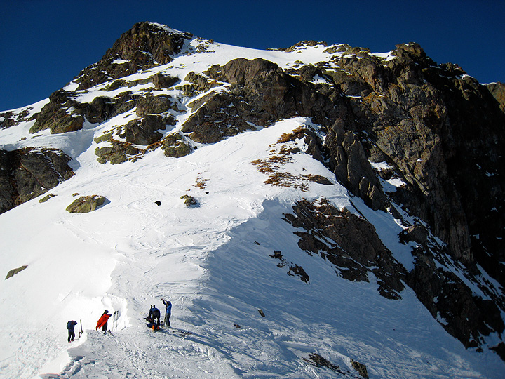 We had our eyes on a steep couloir for this day's tour, descending from the ridge above the hut. It had a few tracks in it, but scope for freshies below. We set out up to the ridge crest in blazing sunshine. |