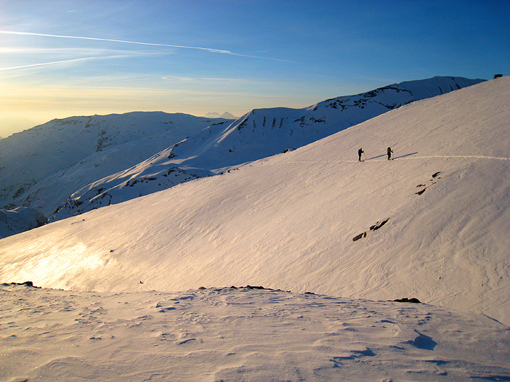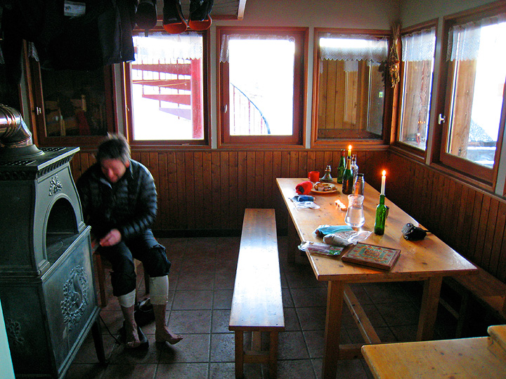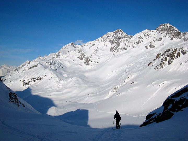 Actually we found lines of better than decent snow in the shelter of the ridge. Climbing back uphill toward the Col de la Croix du Bonhomme and our home for the night, Roger is thinking of dinner as the shadows lengthen. |