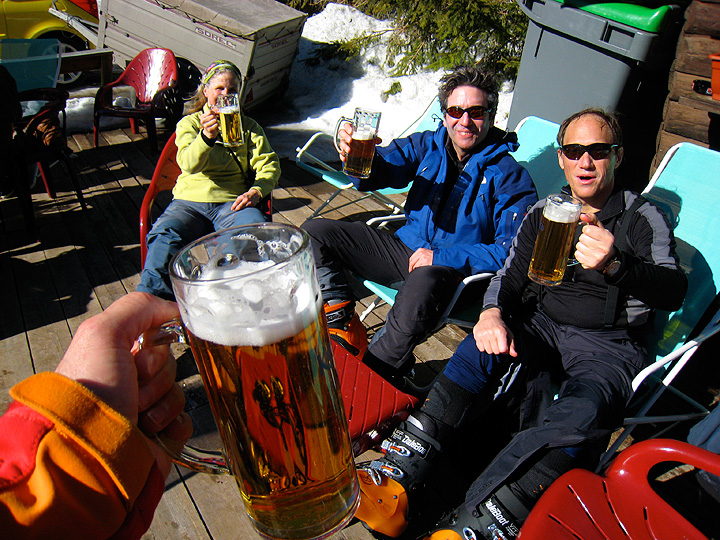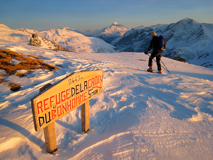 | Roger Weatherby (latest trip the Vélan Haute Route 2008) squeaked in a couple of days of skiing with his friend Rob Wendon and Kathy and Mark, before joining friends and family in Les Arcs. We wanted to include a hut stay, even knowing that the ski touring huts are generally not open at this time of year. In fact, this was part of the charm of this trip, as it meant we were all alone, North American style, and fending for ourselves for meals etc. We selected a route that took us from the ski area at Contamines Mont-Joie, to the Col de la Croix du Bonhomme, which lies on part of the summer route of the Tour du Mont Blanc. |