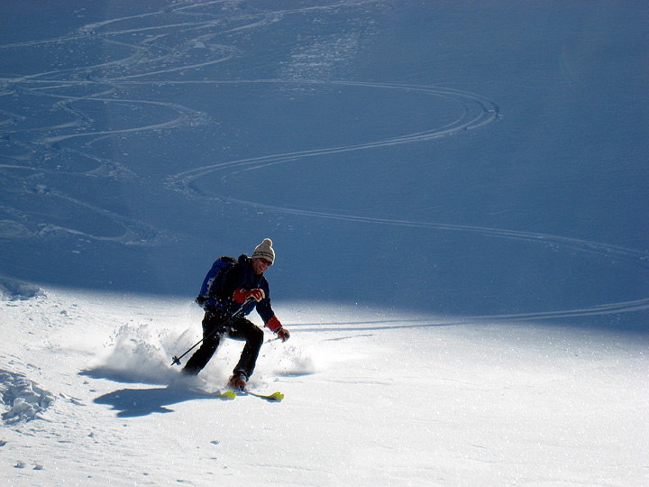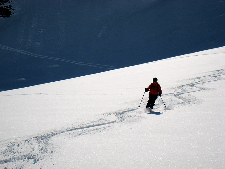 Our couloir turned out to be plenty steep, especially the entry, but filled with good, stable and soft snow. Roger pauses to collect his wits and admire his tracks, mid pitch. |