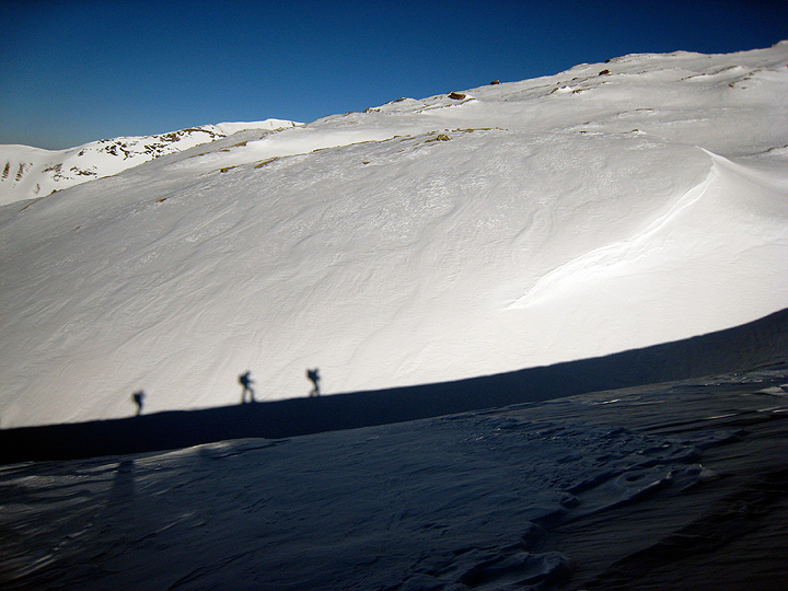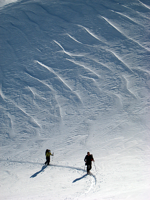 The snow is wind-scoured, but never mind. It's time to go downhill. |