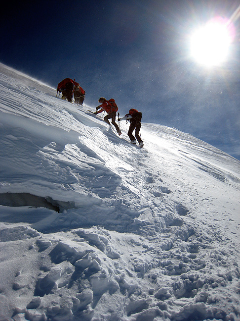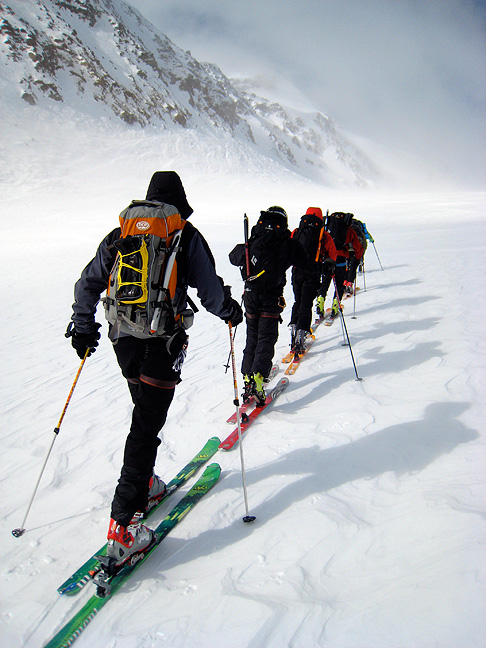 Cold winds, ground blizzard conditions, and wind-blasted snow were our constant and challenging companions on this trip! Here we head up toward Cevedale on day 2. |