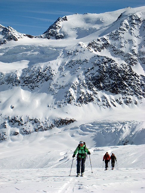 On our last day we finally get calm weather and warmer temperatures for our journey back to town. Here we skin up the Cevedale glacier. |