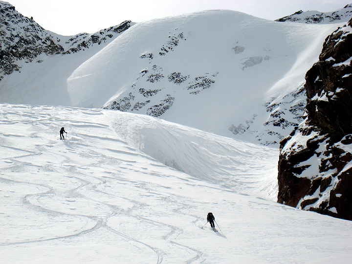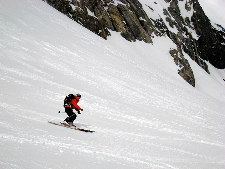 Snow this good was a bit tricky to find, to be honest! The wind had been hammering just about everywhere. But a few relatively sheltered pockets like this one, plus good skiing technique, made for some pretty turns on the descent. |