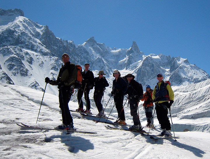 Things looked good, if bony, for the beginning of our tour. Here on the lower part of the Vallée Blanche descent are, from left to right, Mark Houston; Mark Longstaff from the Seattle area; Gary Rowles of SLC, Utah; Tom Drake of Vermont; Peter and Lynne Staub from New Zealand, and Fred Larke from Denver. |
