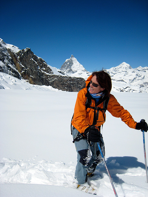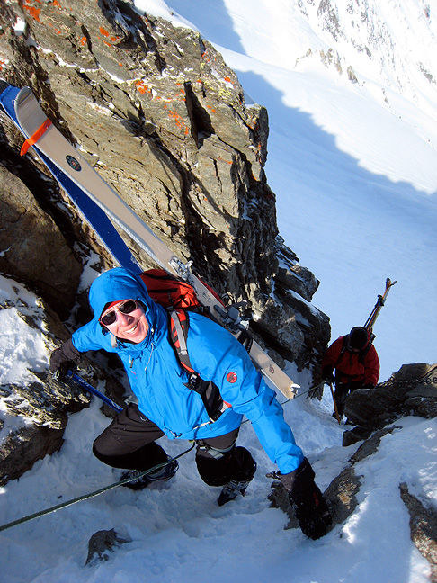 We can see the Col de Valpelline and the Dent d'Hérens in the background as we rip the skins for a beautiful powder run. |