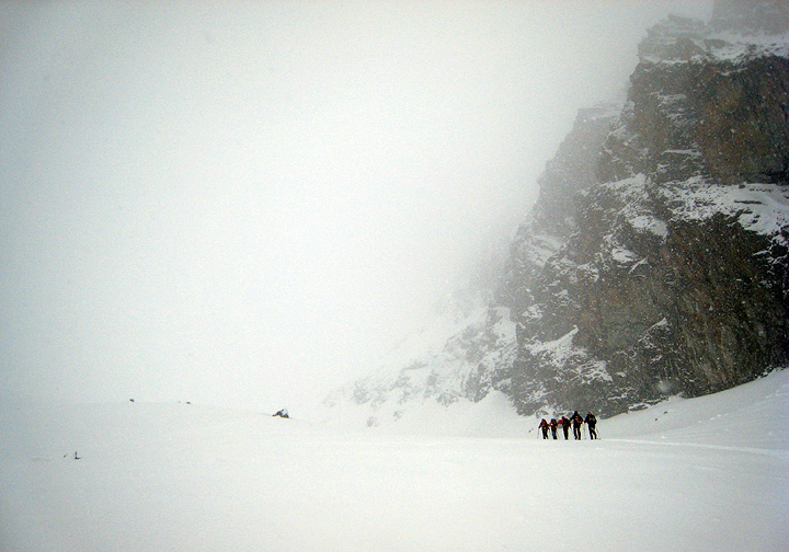 And what a run it was! Deep new snow. HOWEVER, by the time we were near the base of our next climb, up the steep and wind-loaded Col du Mont Brulé, the blizzard had set in once more. After sniffing around the lower slopes for a safe line up it, we finally had to admit we could not be sure enough of the stability to justify the risk of this crux section. We reluctantly turned back and bailed once more to Arolla, via the Haute Glacier d'Arolla. |