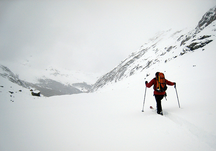 Our night in the Valsorey hut brought a transition to much worse weather. A strong foehn wind from the south blew gusts strong enough to blow us off balance, along with heavy snow up high. We bailed out in order to duck around to Arolla. |