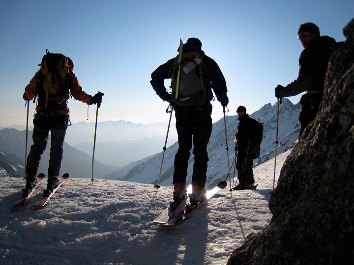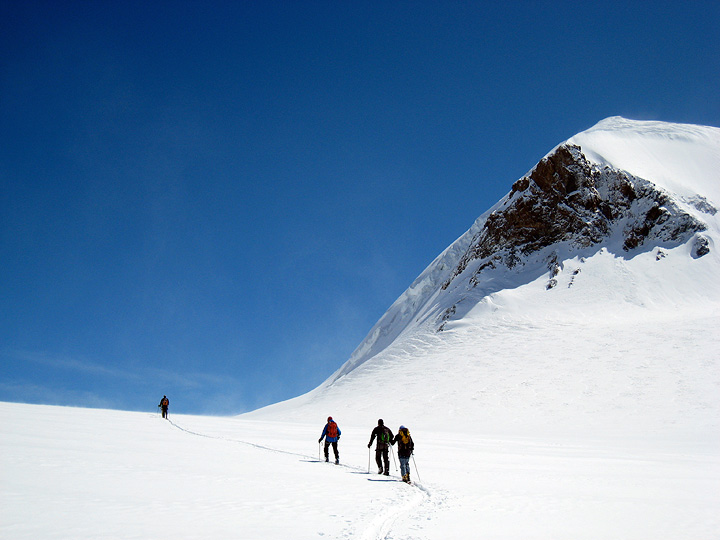 Once that was past, we had a long skin to the top of Mont Vélan. However, as the sun warmed the slopes and the other skiers ahead of us headed for the summit, we began to worry a bit about the wind-loading in the couloir we planned to descend, and also about the long climb back up to the Valsorey hut. We decided to head straight to the couloir, to give ourselves time to reverse course should it prove too loaded. |