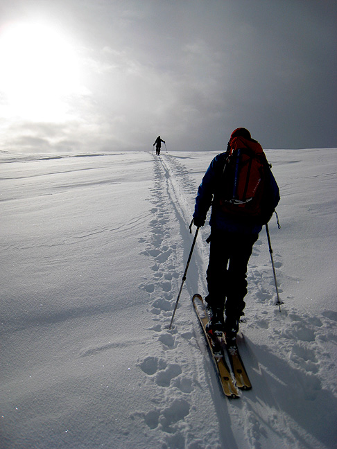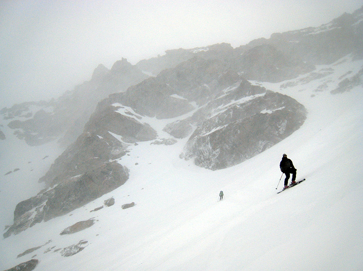 Mark finally gets some welcome visibility after a couple of hours of complete white-out navigation down the glacier. But the fun's not over! Wind-blown snow over warm, deep glop meant hours more entertainment as we post-holed down the gentle grade of the valley leading into town, stopping every few steps to beat the gluey snow from the bases of our skis! Oh lordy! |