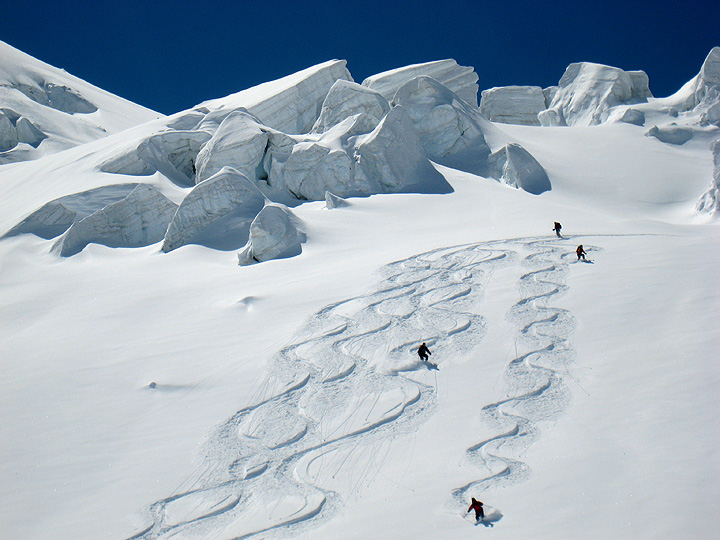 The glacier is so nicely filled in this year, one had a wide choice of lines through the icefall. |
