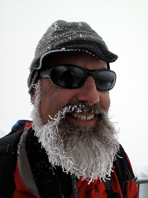 Despite the sunshine in the first picture on our way up the téléphérique, the weather did not last. By late afternoon, thick frozen mist had come in. Matt wears it well! |