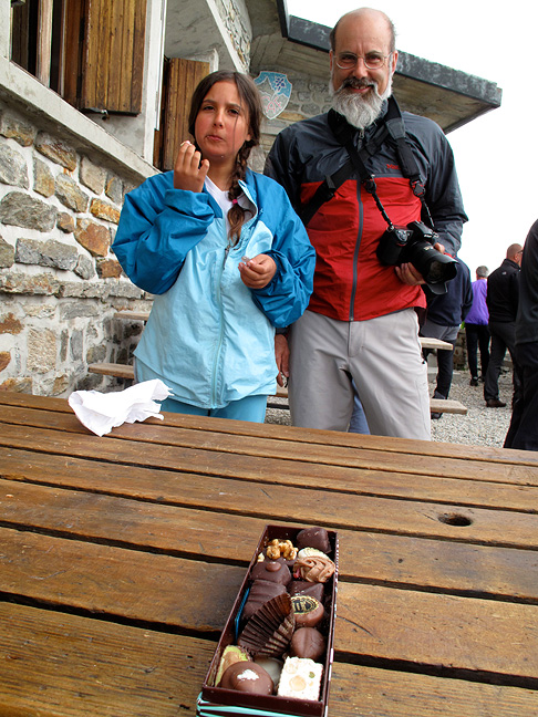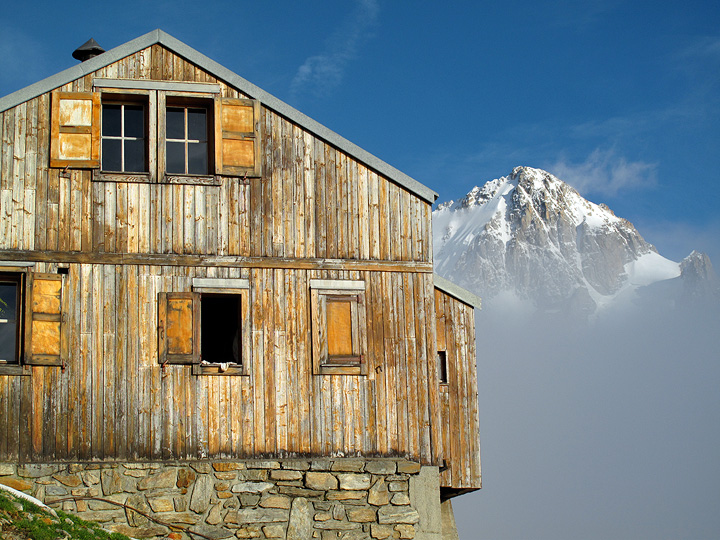 Clouds and mists play with us again today. Toward evening tantalizing glimpses of the surrounding mountains appear (the Chardonnet, in this case). |