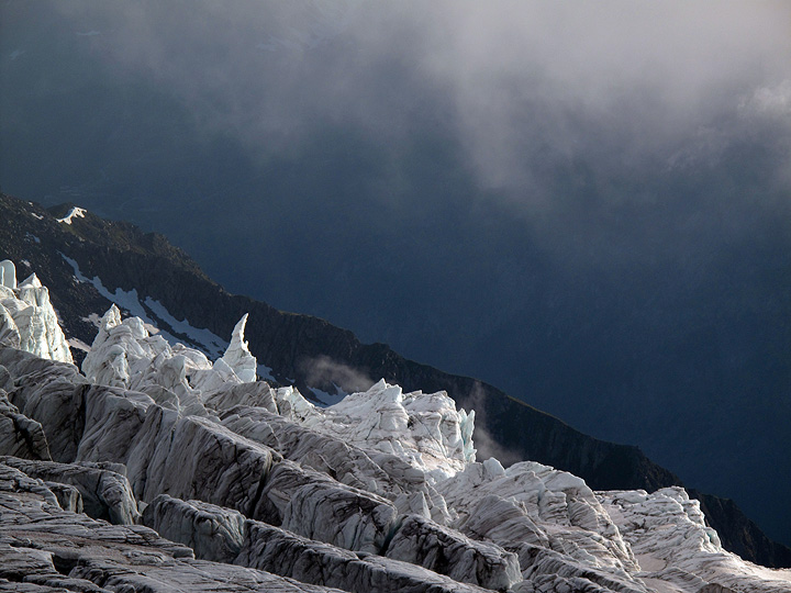 The glacier spills down the steep cliffs below the hut, forming beautiful séracs that catch the last evening rays against the already-dark Chamonix valley below. |