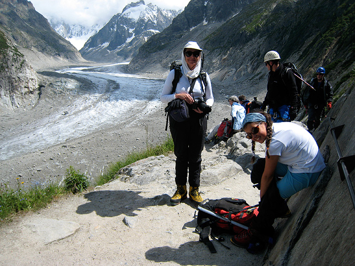 Meanwhile, on the Mer de Glace, Minx and Julia have some fun with Kathy on the ice playground. Here we are pausing at the top of the hundreds of feet of ladder we must down-climb to the ice. Actually this photo was taken in the sunny afternoon; in our case the fog and rain came early and then dissipated as the day wore on. |