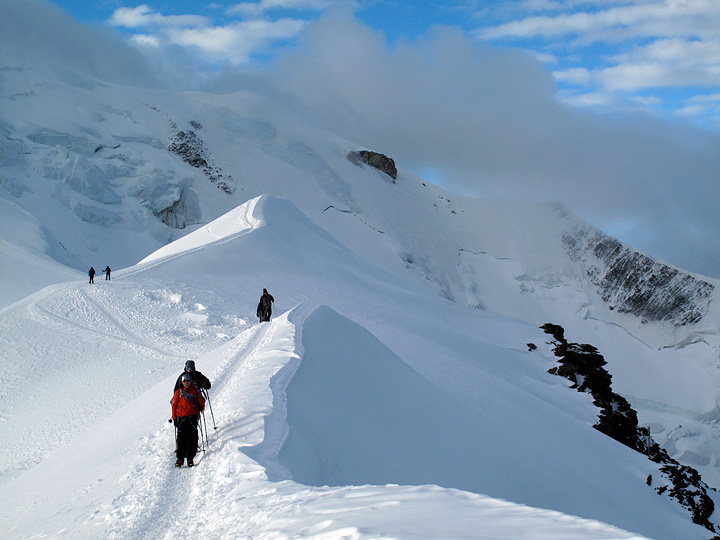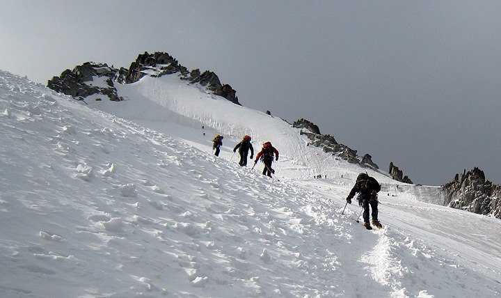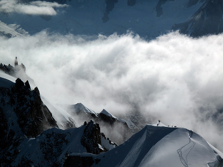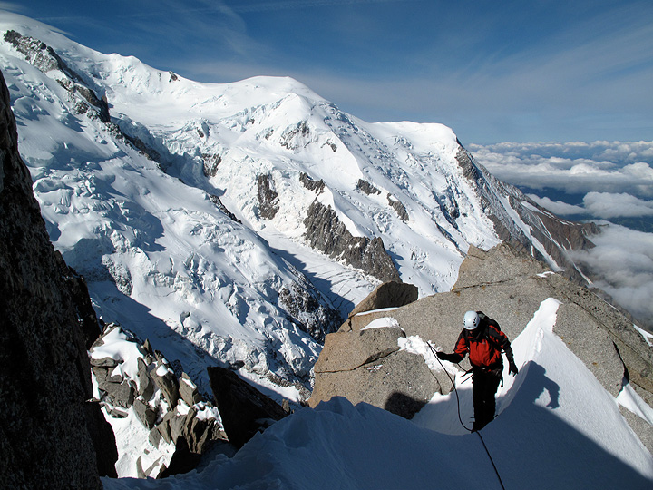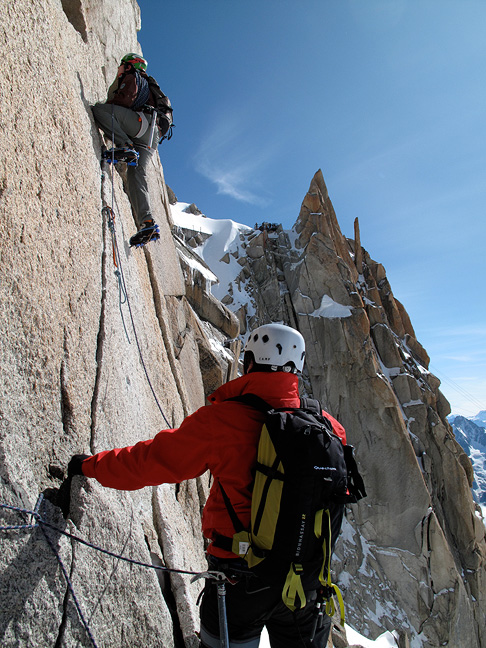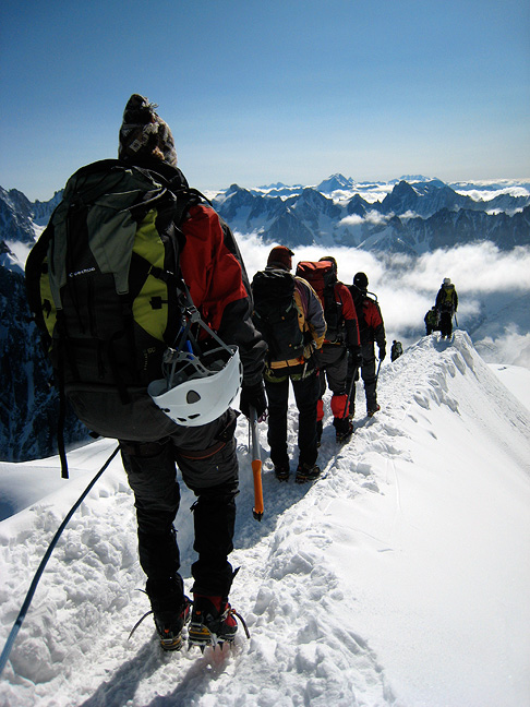 On our first day of mountaineering proper, we all started with an ascent and traverse of the Pointes Lachenal. Here, Ive follows the crowd down the sharp arete off the top of the Aiguille du Midi. |