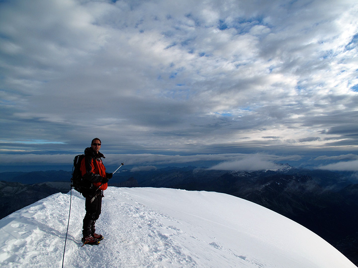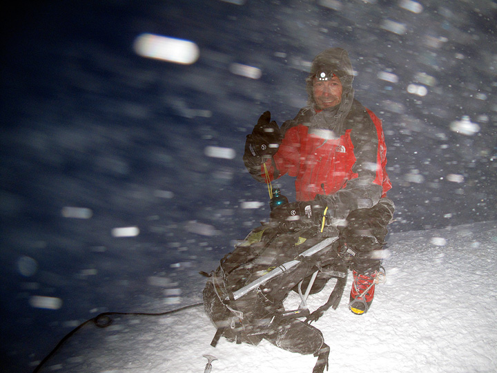 Rising at 2 am, Ive and Mark set off for the summit of Mont Blanc. We had relatively clear weather for the first half of the climb, but cloud and snow came in as we approached the top. This photo, taken on the actual summit, shows a bit of the nasty weather. Fortunately, we were so fast, arriving on top while it was still quite dark, that we were not out long in the poor conditions. |