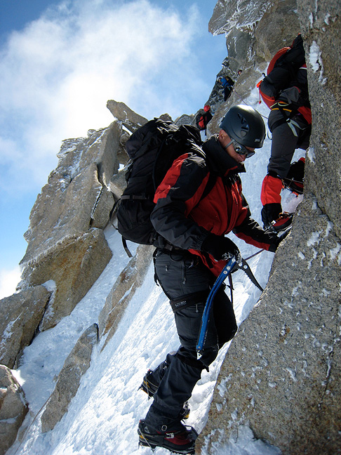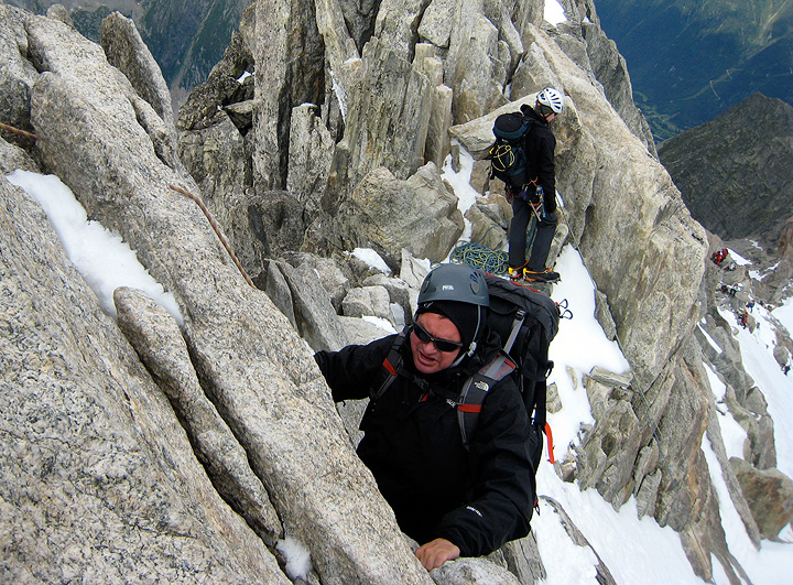 Wim tackles a rocky step on the Petite Aiguille Verte. |