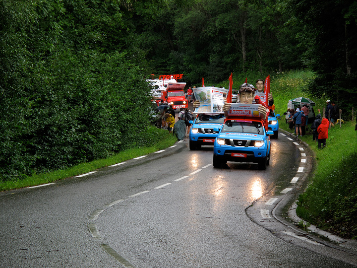 Lined up and waiting for the "Caravane" (the parade of swag wagons tossing goodies to the crowd in advance of the riders). |