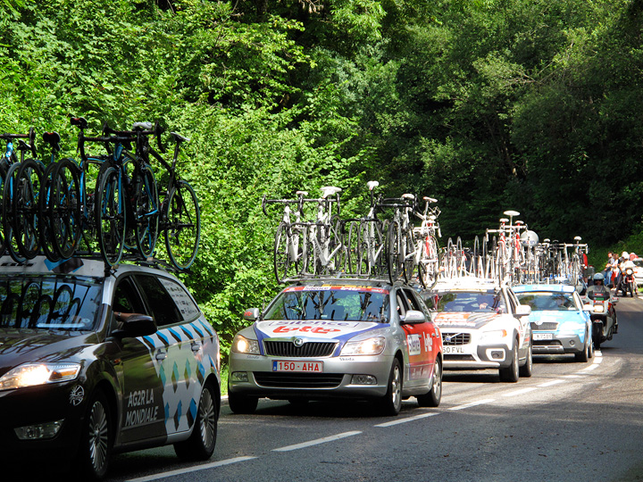 And the usual gaggle of support vehicles drone by as the sun finally dries the pavement. It was a thrill to see the peloton cruise up this relatively "easy" hill, looking like they were having an afternoon stroll. |