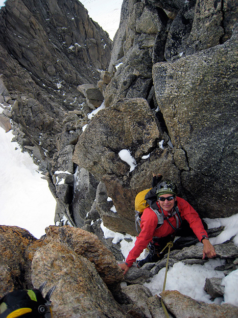 Amy gobbles up the steep mixed couloir to the top of the highest "Pointe". |