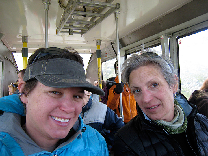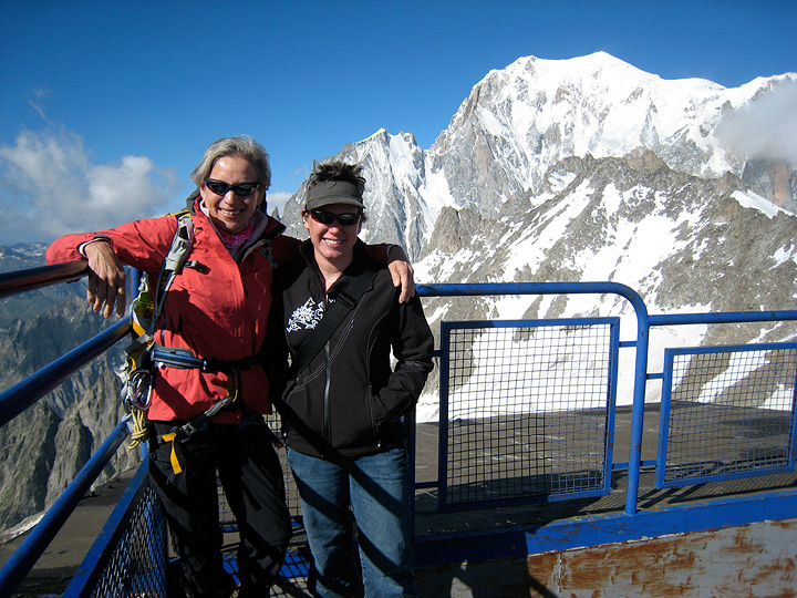 Sadly, Jeannie arrived with a killer cold that just would not quit, so had to sit out much of the alpine climbing. Here she sees her mom off on a climb of the Aiguille d'Entrèves, feeling well enough to ride the téléphérique and enjoy some views. |