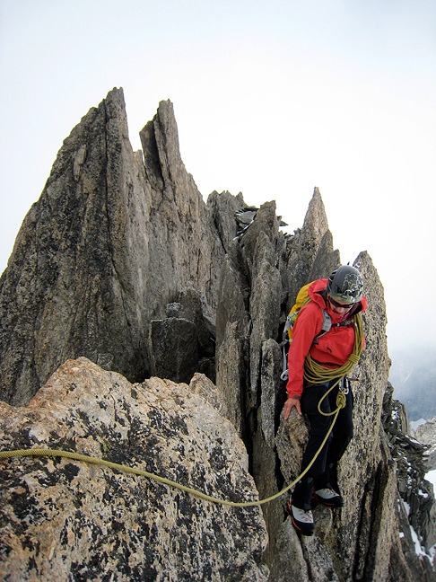 Cold and snowy conditions, plus a bit of lucky timing, made for a tranquil ascent with few other climbers nearby. Jeannie clambers up the easier scrambling down low on the route. |