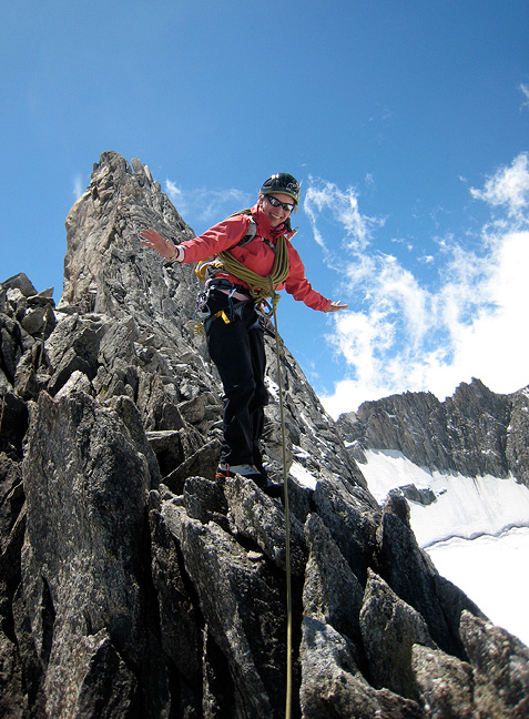 The pointy summit behind her, Amy seems to contemplate flying back down! |