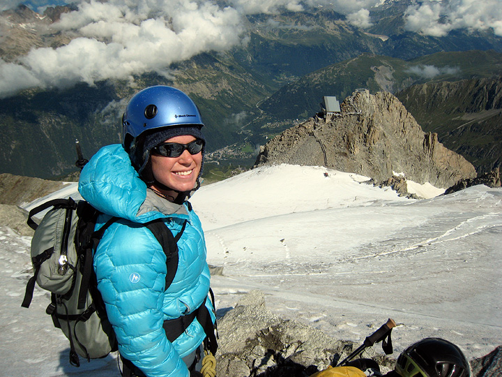 So, on to the climbing! Amy and Kathy climbed the Pointes Lachenal. Amy poses here with the Grandes Jorasses and Dent du Géant in the background. |