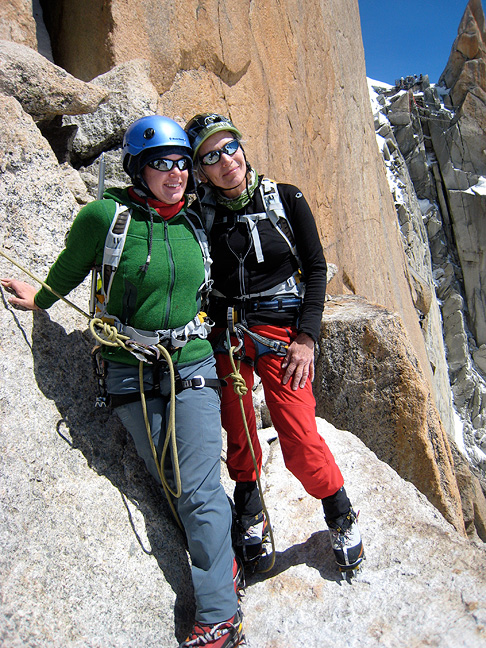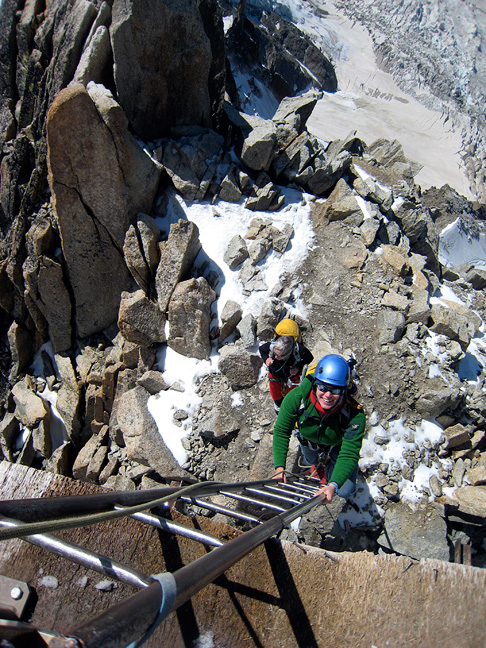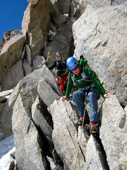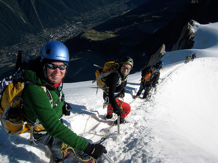 OK, hit the "re-set" button! We'll finish up with a climb of one of our favorite classics, the Cosmiques Arête on the Aiguille du Midi. Anyone visiting Chamonix with climbing plans, really should try to get on this great route. Jeannie and Amy appear un-fazed by the exposure on the exit ridge from the Aiguille du Midi lift station. Chamonix basks in the sun about 9000 feet below. |