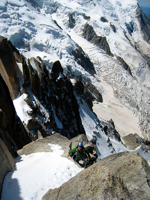 Starting up the traverse of the south ridge, we can almost (but not quite) make out Courmayeur several thousand feet below in Italy. |