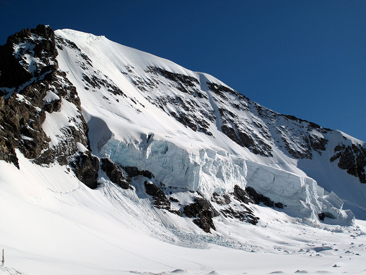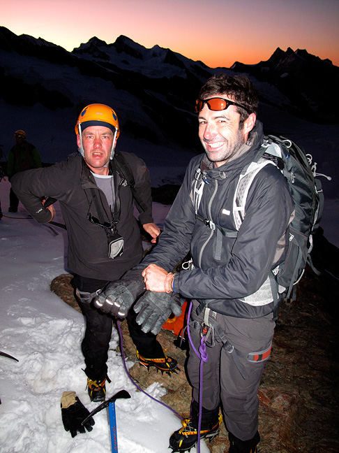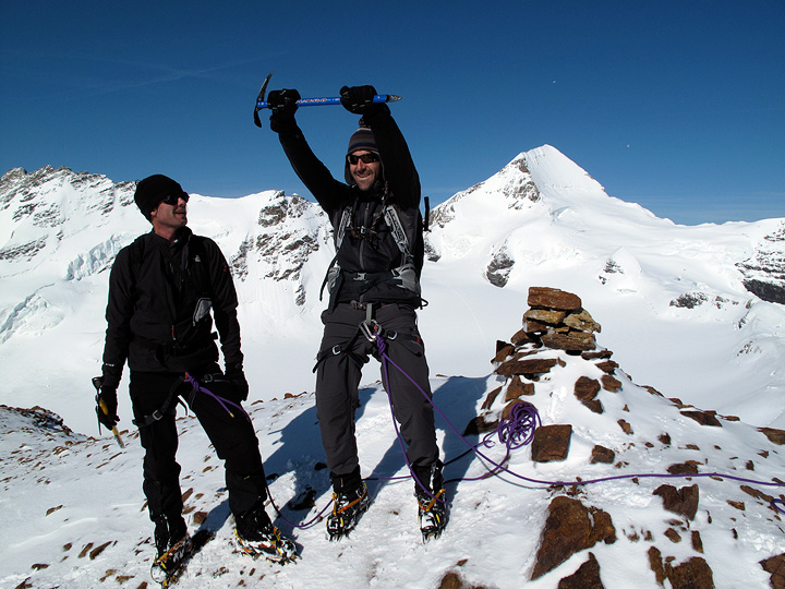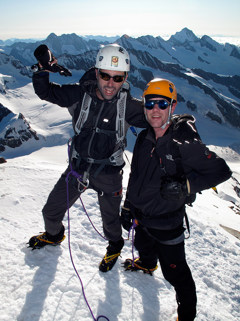 | For several years now, Dave Dougherty has been coming to the Alps to travel, enjoy the mountains and also to climb. This year he was joined by his friend and colleague, Matt Ryan. He, Matt and Mark spent a busy three days in the Berner Oberland. The original plan had included the Mönch and Jungfrau to start, and then Dave and Mark were to try the Eiger. But an sudden, violent storm added yet more snow to the already dusted Eiger, and put the peak out of reasonable condition for several days. In the end, the threesome climbed the Mönch, the Walcherhorn (the day after the storm) and finished on the Jungfrau in perfect weather. |