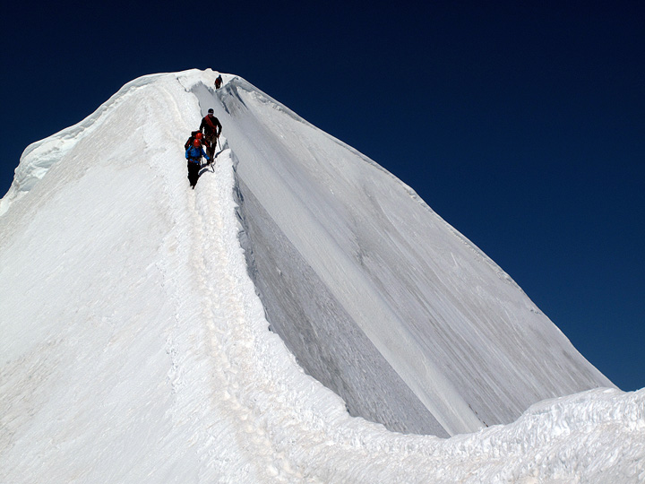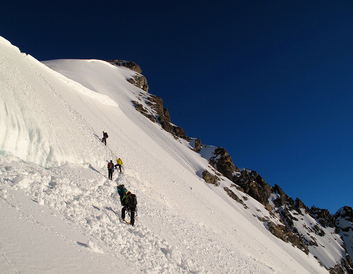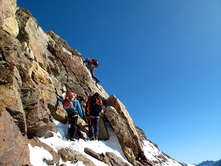 Looking back down on climbers lower in the route, from the Rottalsattel. |
