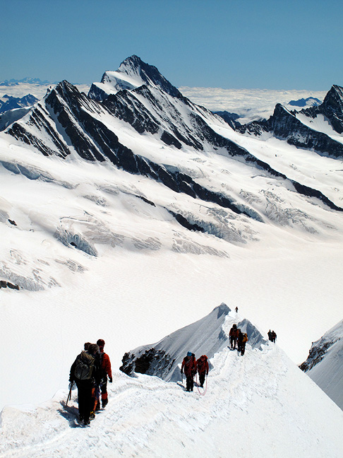 Another party on the last part of the descent. The Jungfrau looms behind. |