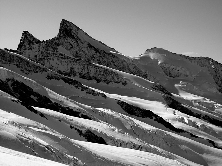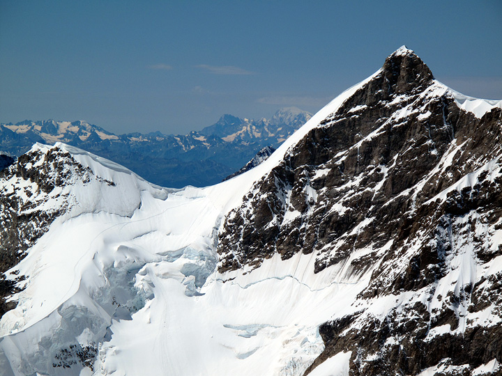 And towards the Jungfrau. Mont Blanc can be seen far behind just poking out from the shoulder of the Jungfrau. |