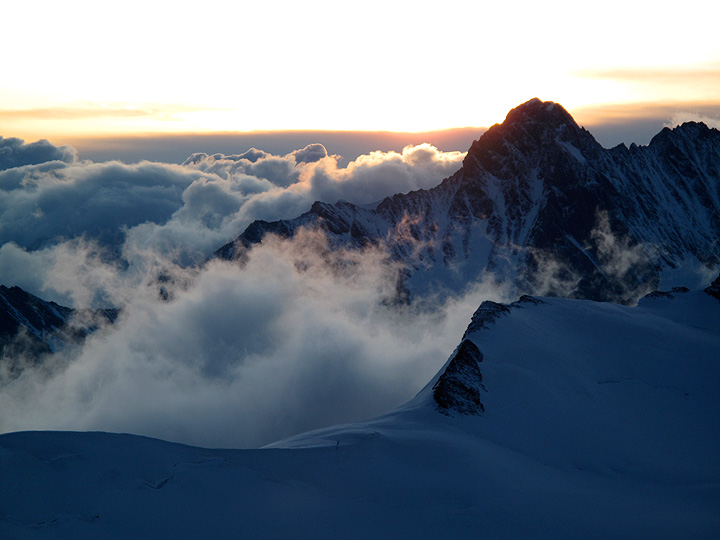 The following morning was beautiful, and we set out towards the Jungfrau. Starting at 4 am, we were quite a ways up by the time the sunrise started glowing in the east. |