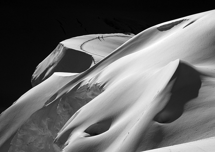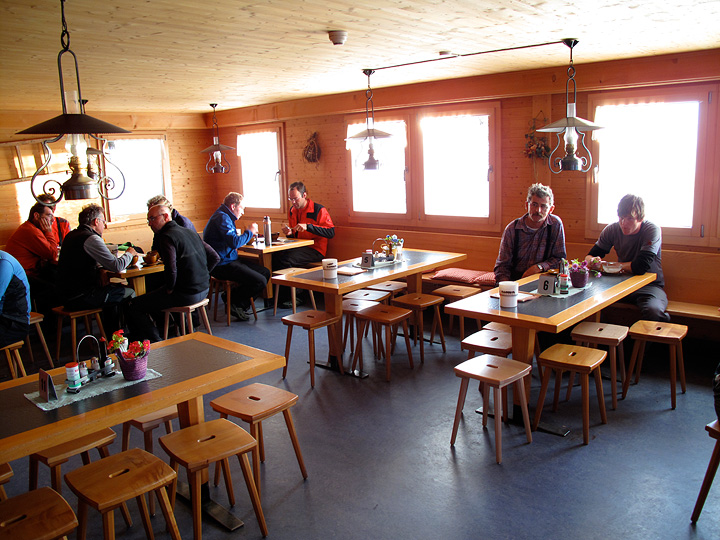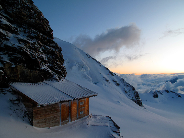 The following night the weather rapidly deteriorated. Wind, and lots of it, an exciting thunder and lightening session and even a moderate amount of new snow seemed to conspire to prevent us from sleeping. At our scheduled breakfast wake-up of 3:30 am, the hut keepers informed us that breakfast would postponed until 6:00 (and then some). Oh well, the Jungfrau would have to wait. |