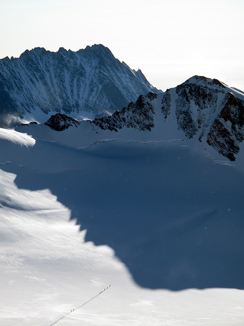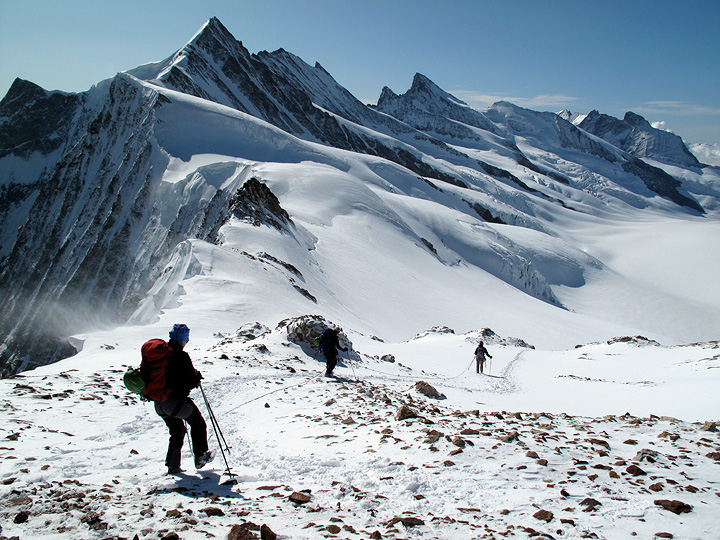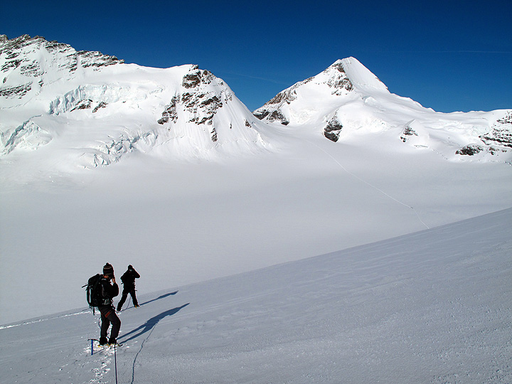 Looking for something more reasonable in the less-than-ideal conditions, we chose the Walcherhorn, a 3692-meter summit on the big ridge leading up to the Gross Fiescherhorn. In this photo it is the peak on the right. Behind on the left is the Lauteraarhorn. Another group can be seen punching in the trail to the peak. |