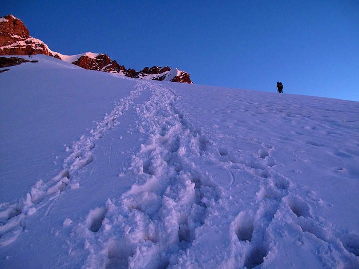 Looking up at sunrise. Fortunately, we had well-frozen snow. These dreadful looking tracks were put in the previous day. |